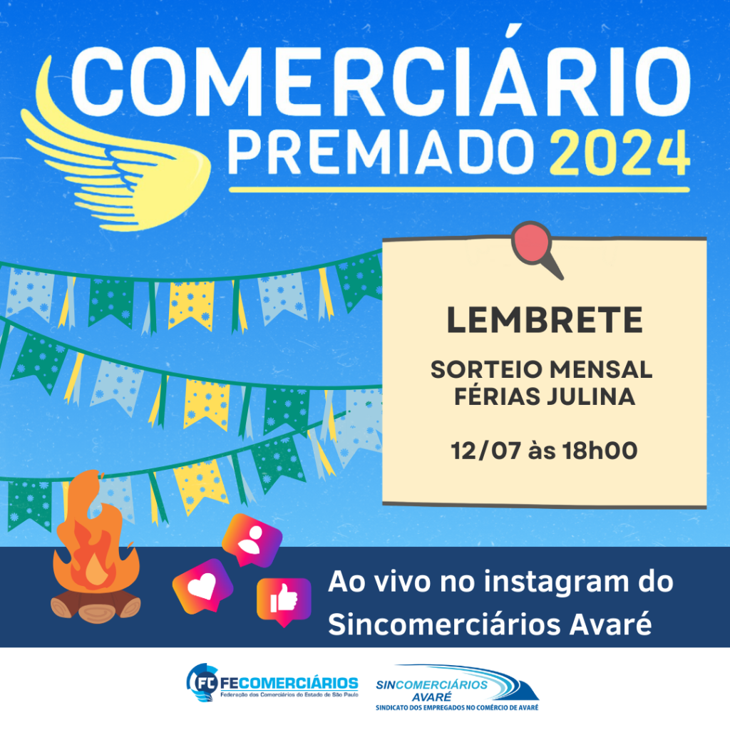 Atenção, associados! A campanha Comerciário Premiado 2024 segue firme, e o próximo sorteio mensal acontecerá no dia 12 de julho, com o tema de férias julina. Para participar e concorrer aos prêmios, basta ser sócio do Sincomerciários de Avaré e preencher seus cupons.