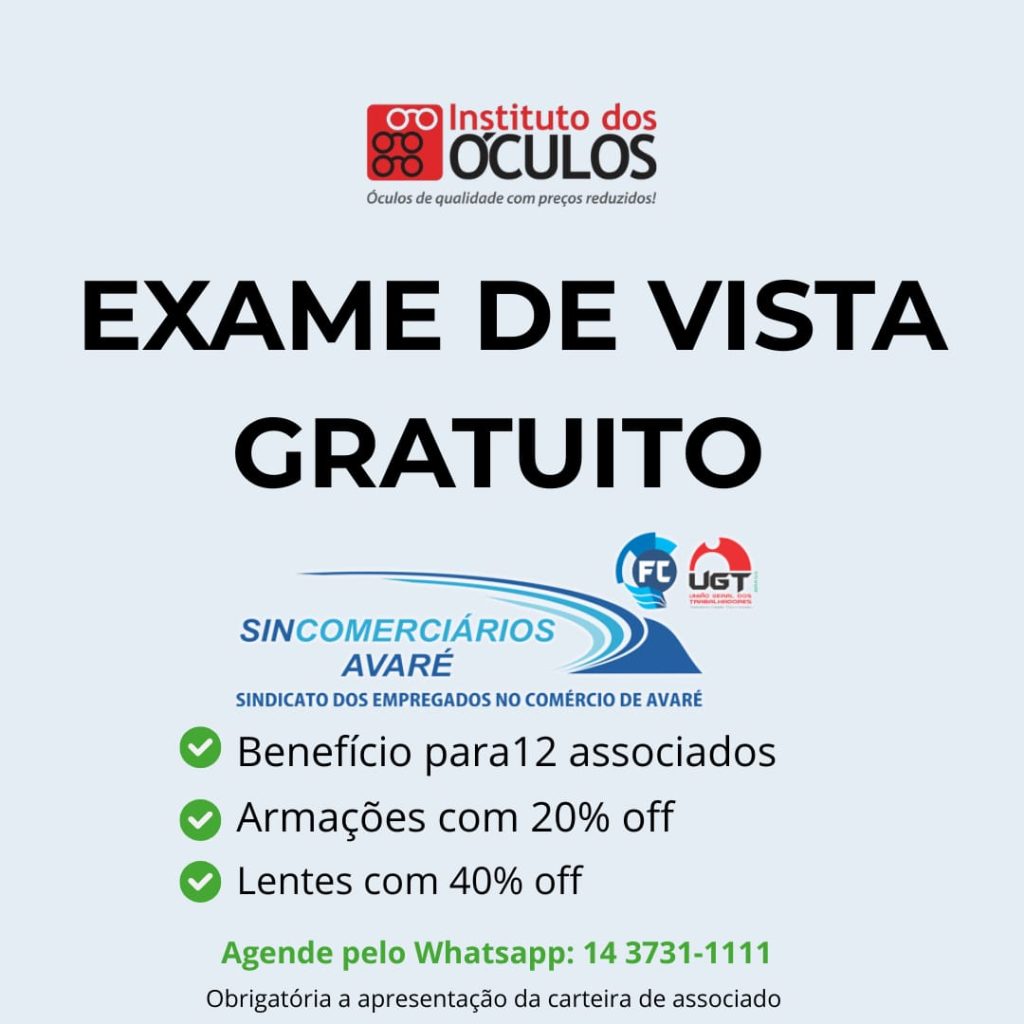 O Sincomerciários de Avaré, em parceria com o Instituto dos Óculos, oferece uma condição exclusiva: um exame de vista gratuito para os 12 primeiros associados que entrarem em contato.