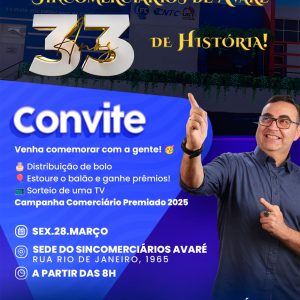 O Sincomerciários de Avaré completa 33 anos no próximo dia 31 de março. A organização sindical comerciária, fundada em 1992,…
