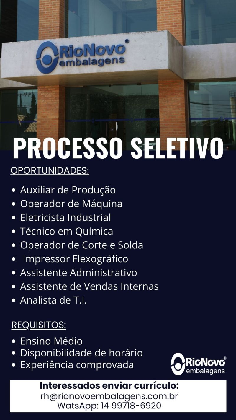 Envie seu currículo via WhatsApp: (14) 99718-6920 e/ou via E-mail: rh@rionovoembalagens.com.br