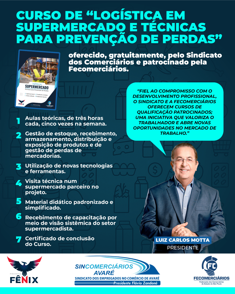 O Sincomerciários de Avaré realizará, de 9 a 13 de junho, o Curso de Logística para Supermercados e Técnicas de Prevenção de Perdas, voltado aos colaboradores de supermercados e demais interessados da região. A iniciativa, oferecida pela Federação dos Comerciários do Estado de São Paulo (Fecomerciários), reforça o compromisso com a qualificação profissional e a valorização dos trabalhadores do comércio.