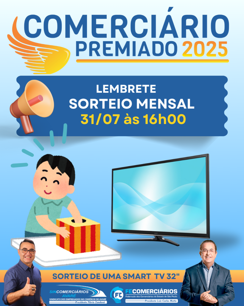 O Sincomerciários de Avaré realizará no próximo dia 31 de julho de 2025 (quinta-feira), às 16h, o 5º sorteio da campanha Comerciário Premiado 2025. A ação será transmitida ao vivo pelo perfil oficial do sindicato no Instagram.