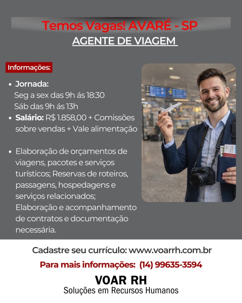 VAGA AGENTE DE VIAGEMVagas de Emprego / Por Bruna Ramos / 24 de fevereiro de 2026 Para mais informações: (14)99635-3594