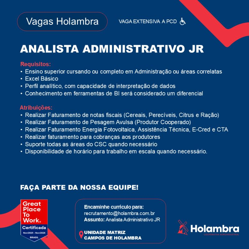 VAGA ANALISTA ADMINISTRATIVO JRVagas de Emprego, Vagas de Emprego Região / Por Bruna Ramos / 25 de março de 2026 Envie o seu currículo: recrutamento@holambra.com.br / Assunto Analista Administrativo JR