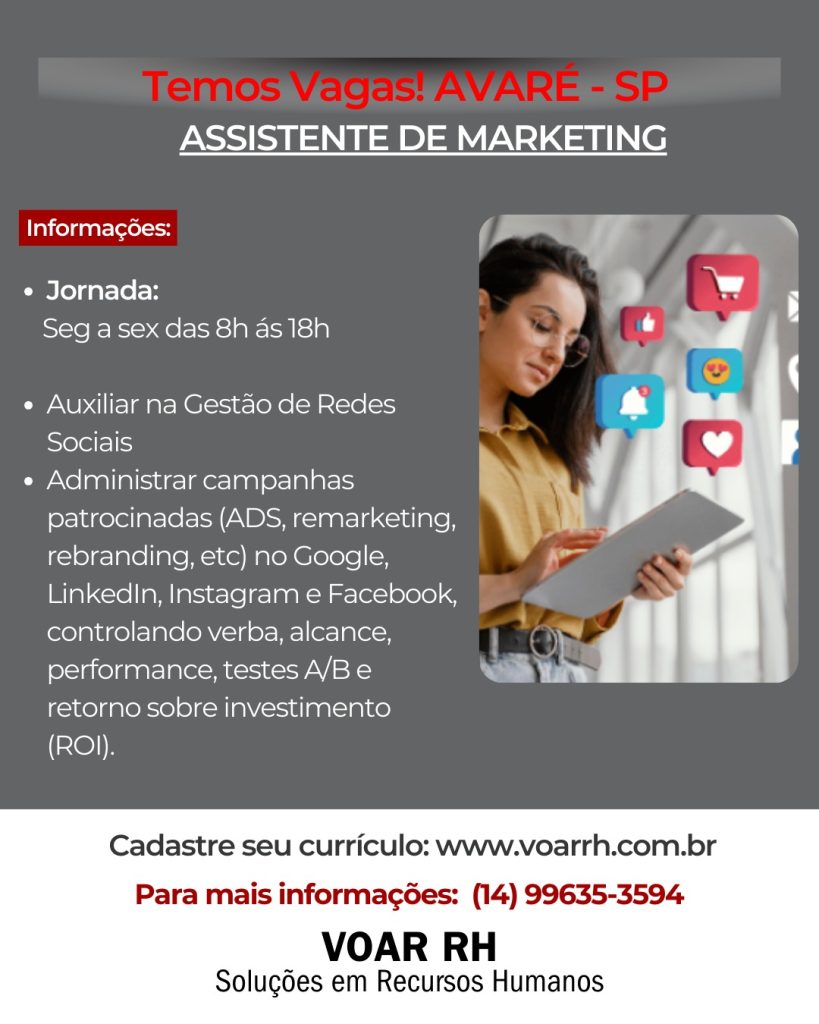 VAGA ASSISTENTE DE MARKETINGVagas de Emprego / Por Bruna Ramos / 24 de fevereiro de 2026 Para mais informações: (14)99635-3594