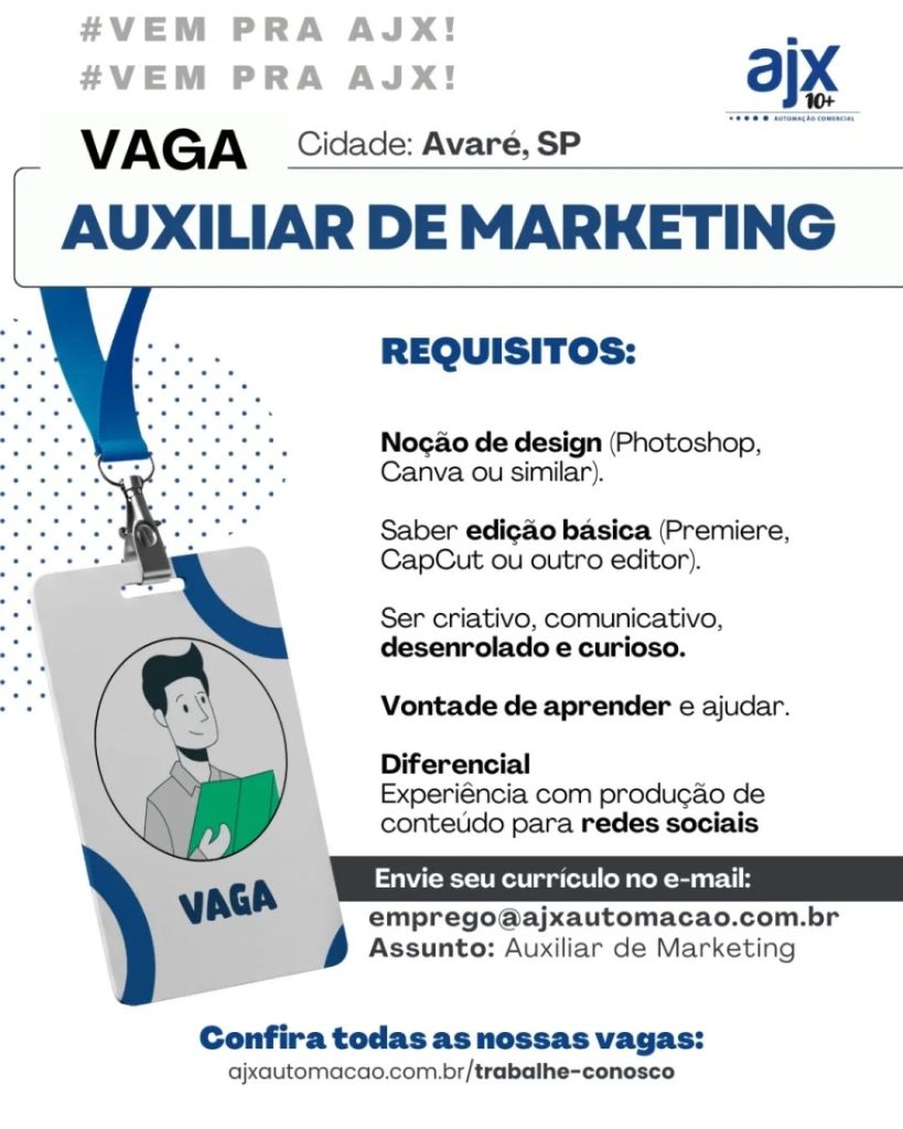 VAGA AUXILIAR DE MARKETING AJXVagas de Emprego / Por Tamires Santos / 26 de agosto de 2025 INSCREVA-SE