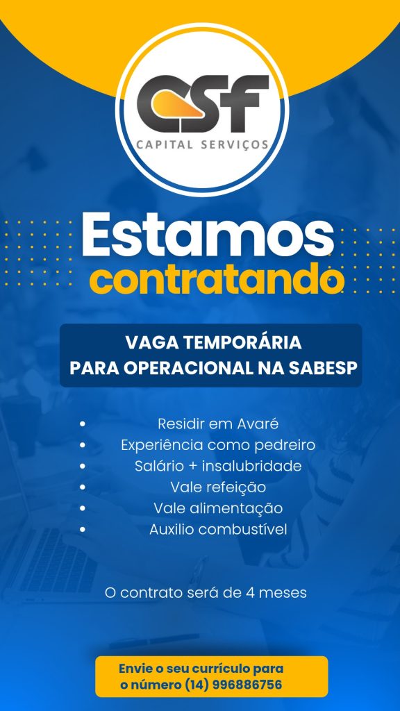 VAGA TEMPORÁRIA SABESPVagas de Emprego / Por Tamires Santos / 6 de agosto de 2025 Envie seu currículo: 14996886756